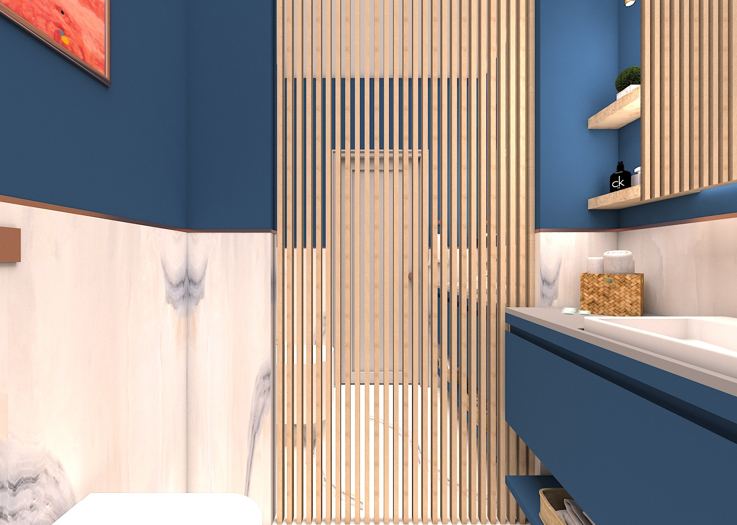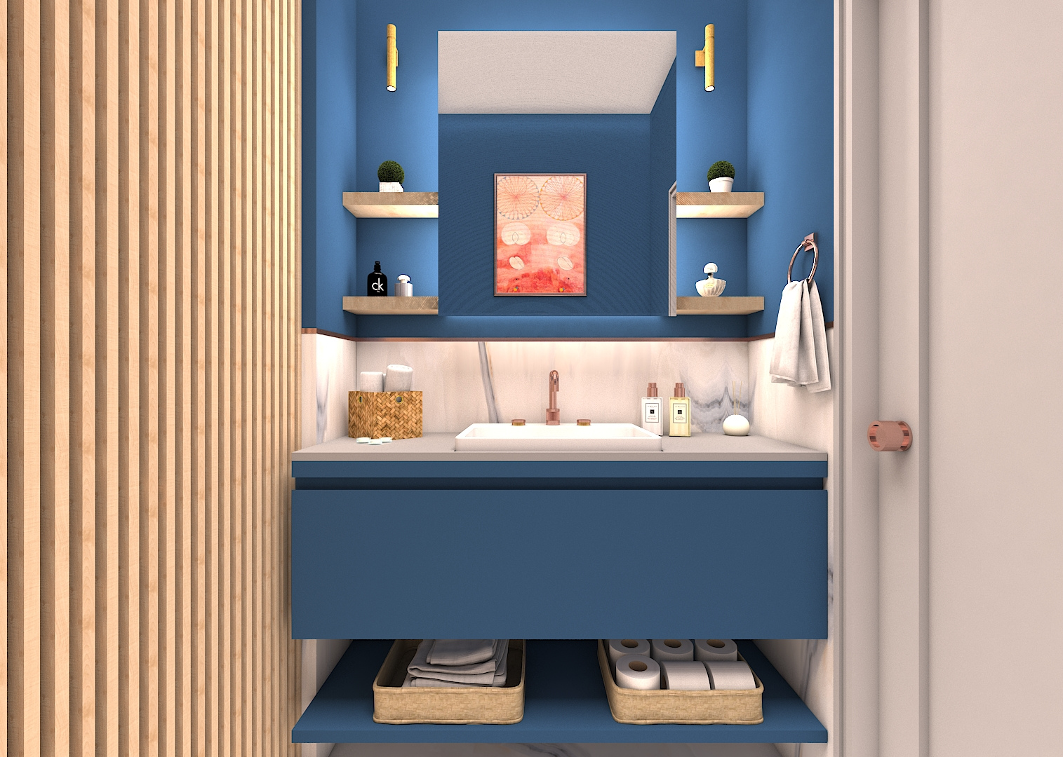 Küçük mekan olduğu için dikey ahşap çıtalar arasında ayna kullanılarak derinlik hissi verilmiştir. Mavi tonları,hasır sepet,ahşap elemanlar ve kırmızı tablo yerleştirilerek yumuşatılmış, sıcak bir alan tasarlanmıştır.