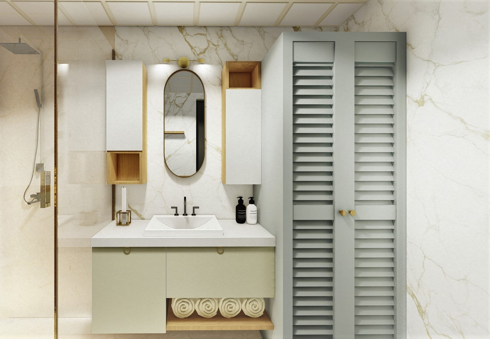 ve kurutma makinalarını üst üste alarak tek bölmeli alanda gizledik. Panjurlu kapak