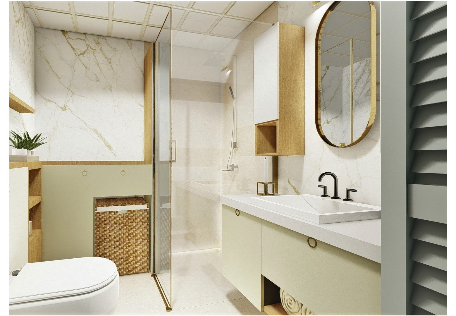 Yaklaşık 6 metrekare alana sahip olan banyomuzu calacatta model seramik ile kapladık. Kaplamamızı kırım işlemi yapmadan mevcut döşeme üzerine gerçekleştirdik. Tavanda 30cmx30cm klipin asma tavan uyguladık. Rezervuarlı klozeti gömme rezervuarlı klozet olarak yeniledik. Duş teknesini kaldırıp